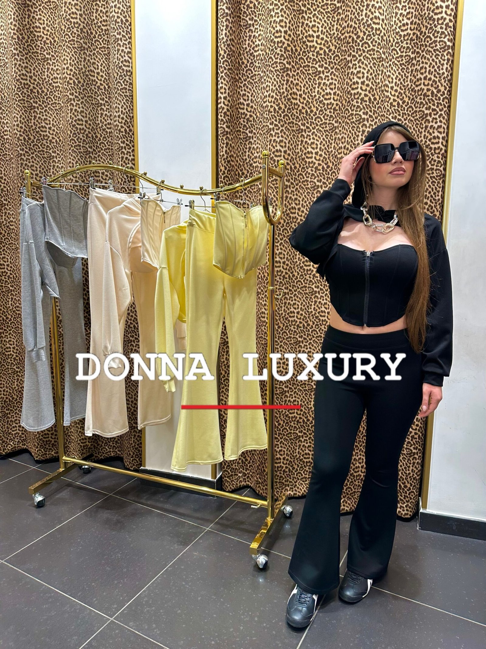 – coordinato tre pezzi : corpetto, pantalone e felpa corta (copri spalla )